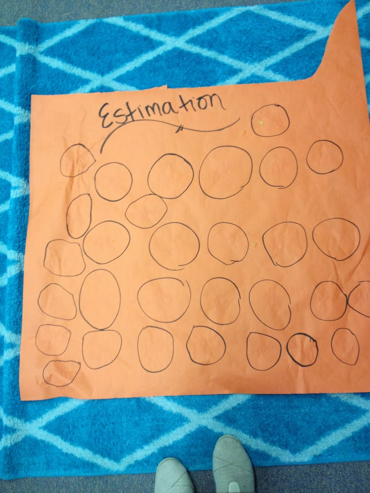Next, we estimated!!! We counted out 10 and used it as our reference. Rather than counting every seed {pure torture, I did it one year}, we estimated groups of ten. As I laid them on the chart paper, I chose one student to circle each group.